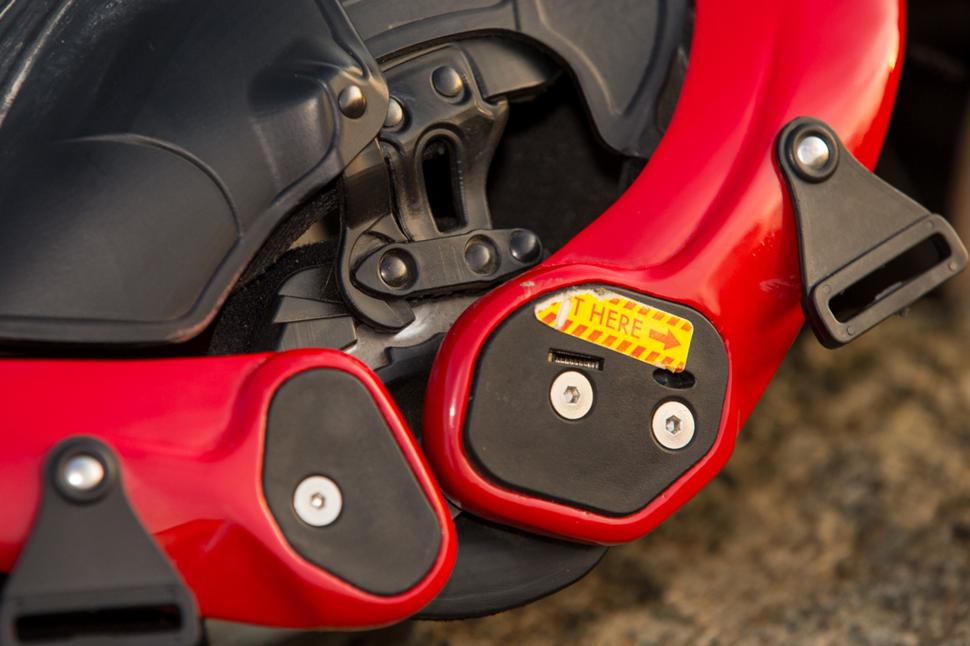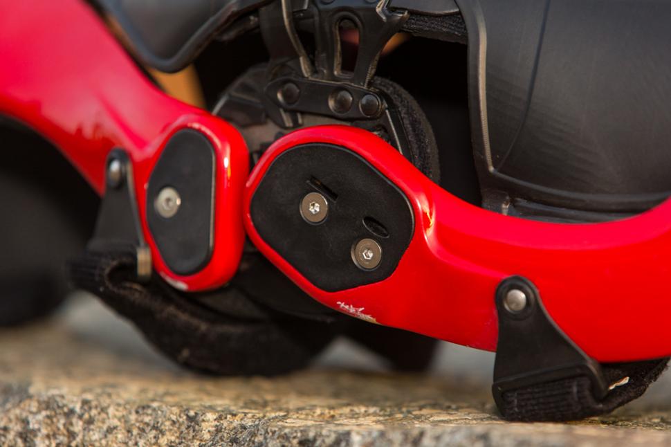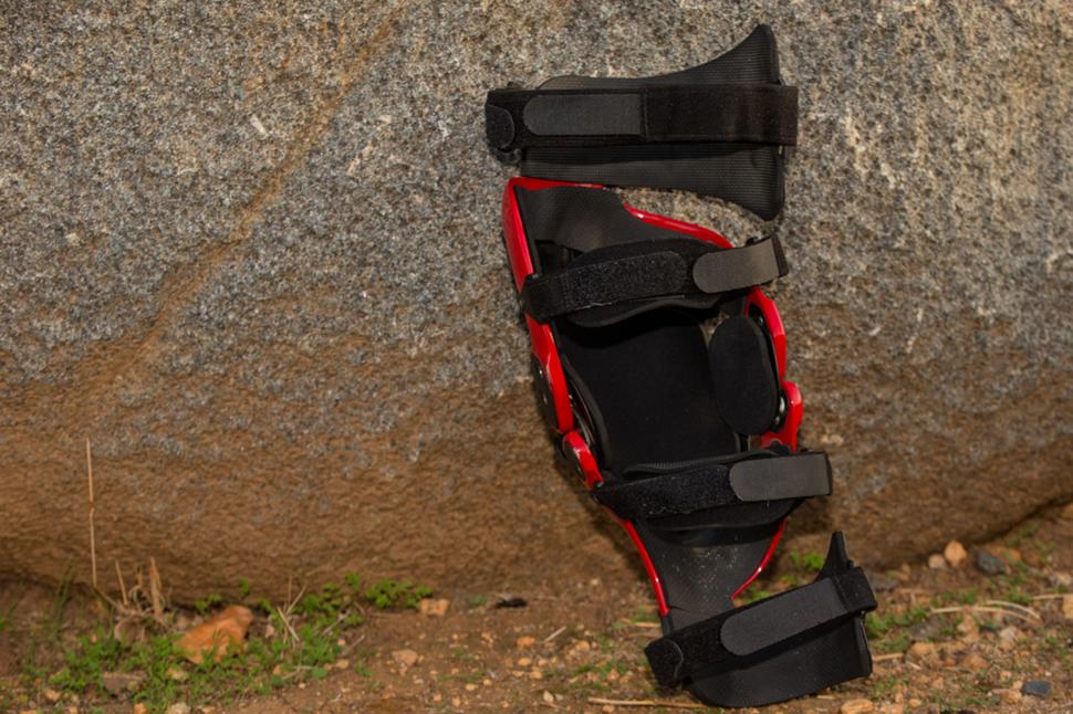 Еще один важный элемент—это движение верхнего и нижнего брейсов. Только представьте, что при движении верхняя и нижняя рамы смещались бы немного вправо-влево относительно друг друга. Но они не стучат друг об друга, а позволяют раме плотно прилегать к ноге. Пилоты, которые не могут похвастаться идеально ровными ногами, должны по достоинству оценить конструкцию этих наколенников, потому что нижняя часть выравнивается относительно верхней части. При этом нога чувствует себя очень комфортно, нижний брейс не давит на ногу, как бывает в других наколенниках.