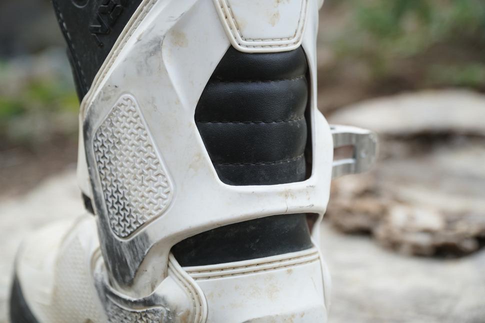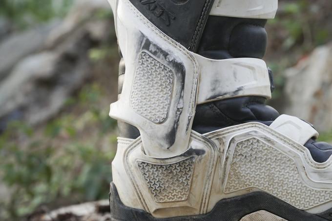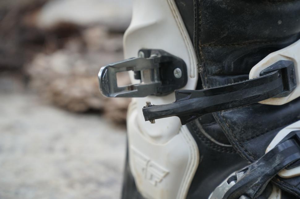 Кстати, о шарнире, это крутая особенность Fly Racing FR5, но недостаточно крутая. Позвольте мне объяснить. Сам по себе "биомеханический шарнир" - это треугольный язычок пластика, находящийся в пластиковом же пазу. Язычок направлен как стрелка сверху вниз, и такие пары из язычка и паза находятся на обеих сторонах голени ботинка - внутренней и наружной. Когда голеностопный сустав сгибается, язычок продолжает оставаться в пазу, практически не изгибаясь, в отличие от систем с цельным куском пластика, защищающих голеностоп на ботах начального уровня. Такой шарнир, хоть и не имеет оси вращения, является полноценным защитным элементом мотобота.