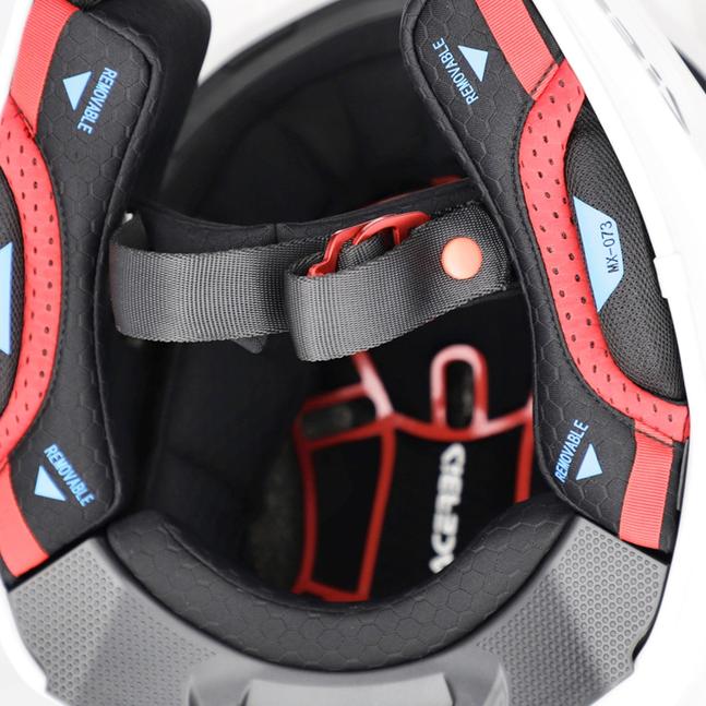 Ещё одно приоритетное направление разработки Airstrike FIM Racing #2 для Acerbis - это комфорт. Внутренняя подкладка полностью съёмная и моющаяся, изготовлена из гипоаллергенных, дышащих, комфортных материалов, эффективно отводящих влагу. Система A.C.S. (Acerbis Comfort System) улучшает посадку шлема и внутренний обдув, а щёчные подушки оснащены новой аварийной системой быстрого снятия QRS, легко узнаваемой по силиконовым логотипам. Ремешок шлема застёгивается на двойную D-образную пряжку Ergal красного цвета.