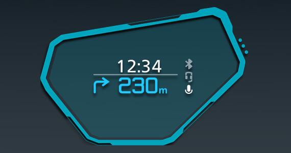 Перед правым глазом райдера в нём расположен регулируемый по вертикали проекционный (HUD) дисплей, а сам проектор расположен внутри челюсти шлема. Электроника шлема связывается по Bluetooth со смартфоном и проецирует на прозрачную панель дисплея "голографические" подсказки навигатора, не перекрывающие обзор.
