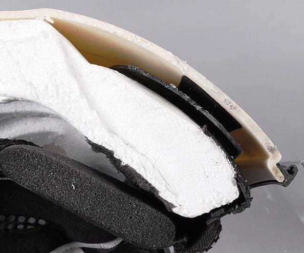 Благодаря прочной внешней скорлупе наполнитель может быть довольно мягким, что позволяет сделать шлем удобнее и снизить передачу сил от скорлупы к голове. Arai имеет цельный наполнитель, но он имеет участки разной плотности (то есть в которых размер, форма и толщина стенок пузырьков варьируются благодаря использованию разных компаундов и техпроцессов). Это позволяет наполнителю обладать большей структурной целостностью (иначе говоря, не рассыпаться от небольших воздействий при надевании, например), лучше распределять энергию столкновения, отводя её от самых уязвимых частей головы, но это же делает процесс изготовления дороже.