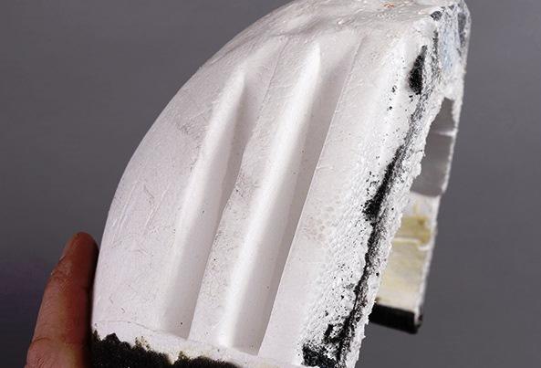 В большинстве шлемов вспененный защитный наполнитель, слой которого находится прямо под скорлупой и защищает голову от ударов снаружи, одновременно поглощая и часть кинетической энергии от удара изнутри, сделан из пенополистирола. Однако, его структура может существенно отличаться от бренда к бренду: в дешёвых моделях наполнитель - это просто круглая цельная чашка из пенополистирола (в лучшем случае - с вентиляционными каналами), чуть более дорогие варианты могут иметь разную толщину и/или плотность на разных участках головы и насечками, одновременно играющими роль вентиляции, но основное предназначение которых состоит в том, чтобы изменять плотность наполнителя и тем самым перераспределять энергию удара.