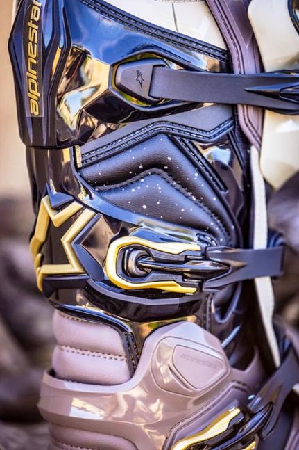 Защита усилена в нескольких ключевых зонах. Задняя часть голени теперь усилена термопластическим полиуретаном (TPU), а новая TPU-перемычка вокруг лодыжки и ахиллова сухожилия помогает ограничить гиперэкстензию (переразгибание) и повышает общую ударопрочность. Передняя система сгибания, позаимствованная у модели Tech 10 Enduro, действует как прогрессивный амортизатор, снижая избыточное сжатие при сильных ударах.