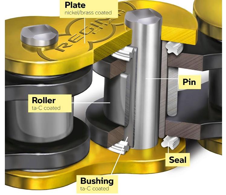 Да, если соблюдать эти правила, цепь Regina HPE прослужит не меньше, а то и больше обычной сальниковой цепи, да и звёзды с такой цепью проходят дольше. В общем, хорошая идея разбилась о несколько кривую реализацию и о маркетологические ухищрения. Цепь, которую требуется смазывать реже, позволяет снизить количество вредных химикатов, разбрасываемых по дорогам, и просто уделять ей меньше внимания. Но для того, чтобы эта цепь была действительно долговечной и надёжной, нужно покрывать алмазоподобным покрытием ta-C ещё и пины (оси) звеньев, а сальники в ней должны быть намного более устойчивы к работе на сухую в тяжёлых условиях.