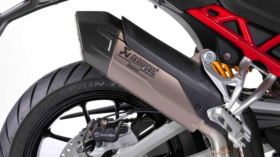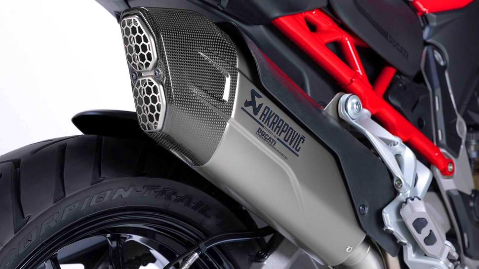 А для тех, кого больше интересует прирост производительности для повседневной езды, Akrapovič готовы предложить омологированный для дорог глушитель. Он состоит из титанового сплава и карбона и весит на 700 граммов меньше штатного (кроме модели Multistrada V4 S Sport, которая с завода оснащается более лёгким глушителем).