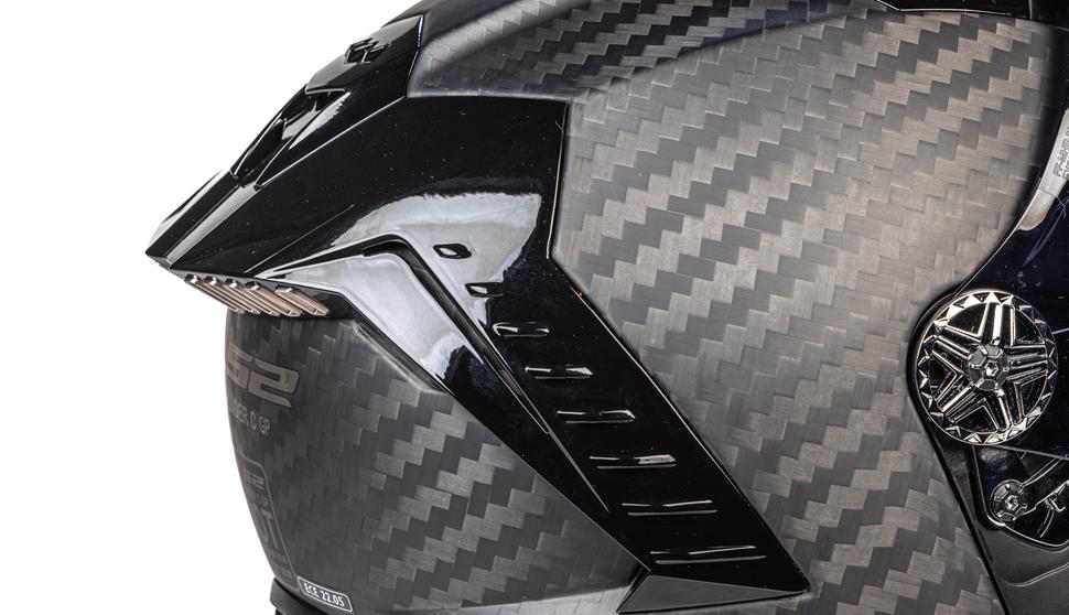 Внешние элементы Thunder Carbon имеют чёрную отделку - воздухозаборники, спойлер, даже визор очень тёмный. Задний спойлер, кстати, здоровенный и сильно выступает назад. При этом стоит отметить, что LS2 чрезвычайно уверенно сидит на голове на высокой скорости - его не треплет и не прижимает, при этом в нём отличный обзор, а трёхмиллиметровые визоры (прозрачный лежит в коробке) оснащены креплениями для отрывников и пинлоком.