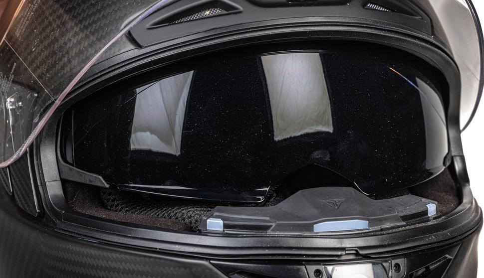 Что приятно, Scorpion как выбрали грамотную стратегию повышения лояльности, так и придерживаются её: в отличие от многих брендов, в том числе премиальных, Scorpion к каждому шлему в комплекте прикладывает затемнённый визор. Оба, и прозрачный, и затемнённый, подготовлены к установке пинлока, что приятно, потому что он тоже есть в комплекте. Механизм смены визора простой и удобный, меняются они без инструментов - достаточно потянуть язычки, чтобы снять один визор, и потом вщёлкнуть другой. Механизм блокировки визора теперь расположен по центру, и при закрытии издаёт хорошо слышный щелчок, который ощущается даже рукой в перчатке. Правда, защёлка теперь находится прямо над воздухозаборником, поэтому, открывая визор, иногда сначала нащупываешь его. Но знаете, для карбонового шлема за 400 долларов это не самый страшный недостаток.