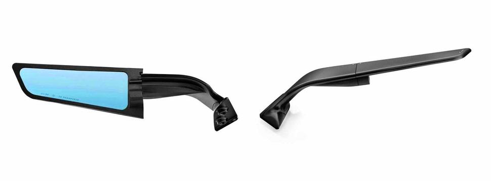 Впрочем, спрос на MotoGP-шные технологии на массовом рынке велик, и одним из вариантов оснастить свой спортбайк стильными аэродинамическими крыльями являются зеркала Rizoma Stealth. Гладкие обтекаемые зеркала установлены на своих штоках на оси, и будучи развёрнутыми вниз, они работают как аэродинамические крылья, создавая прижимную силу в 4кг на скорости 300км/ч. Это, конечно, не 36кг прижимной силы с Panigale V4, но безусловно лучше, чем ничего.
