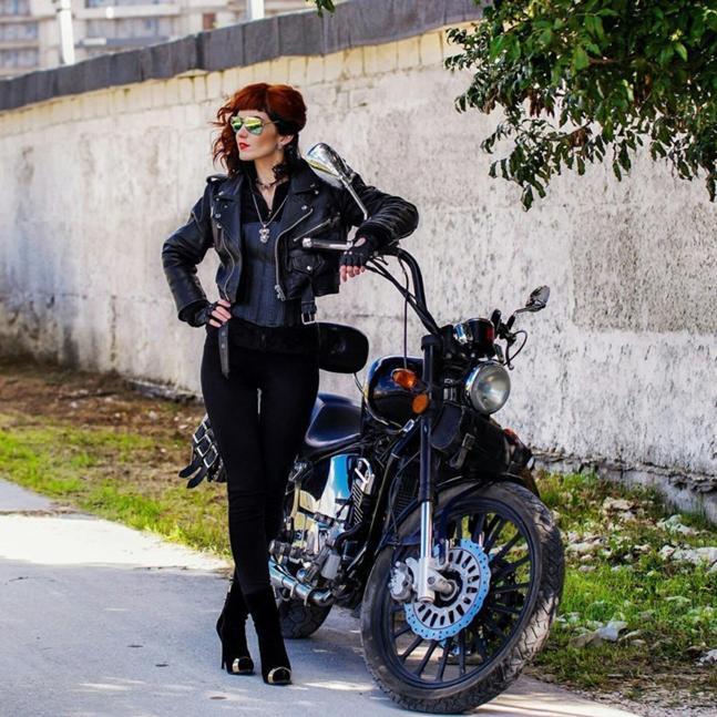 Девушки стоят рядом с мотоциклом.