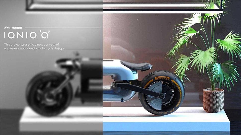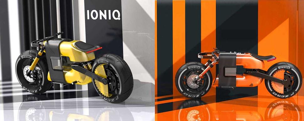 Именно таков подход и цифрового дизайнера Джи Вун Ча из Сеула, который решил пофантазировать над тем, как Hyundai могли бы интегрировать в свою линейку Ioniq электрический мотоцикл. Обычно производители мотоциклов представляют двигатель как неотъемлемый элемент дизайна, а аккумуляторная батарея на электроциклах выглядит как громоздкая нашлёпка на шасси, но Ча решил использовать в своём концепте Ioniq Q противоположный подход.