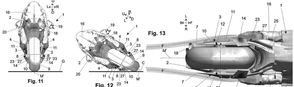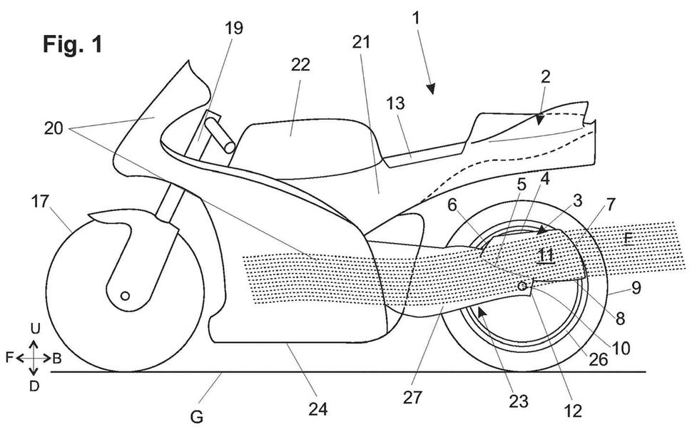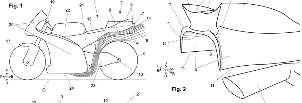 Первый из документов относится конкретно к необычным на вид расширениям, выступающим по бокам от маятника и образующим поверхности, практически полностью закрывающие верхнюю часть заднего колеса. На первый взгляд кажется, что они предназначены для плавного обтекания воздушным потоком, который проходит над нижней частью боковых панелей и направляется точно к задней части мотоцикла, минимизируя тем самым турбулентность, создаваемую вращающимся колесом и лучами колёсного диска. Это должно снизить общее сопротивление воздушного потока и повысить максимальную скорость при том же значении мощности. Патент подтверждает это, но говорит, что это лишь вторичный эффект конструкции, а их истинное назначение - это улучшение управляемости мотоцикла в поворотах.