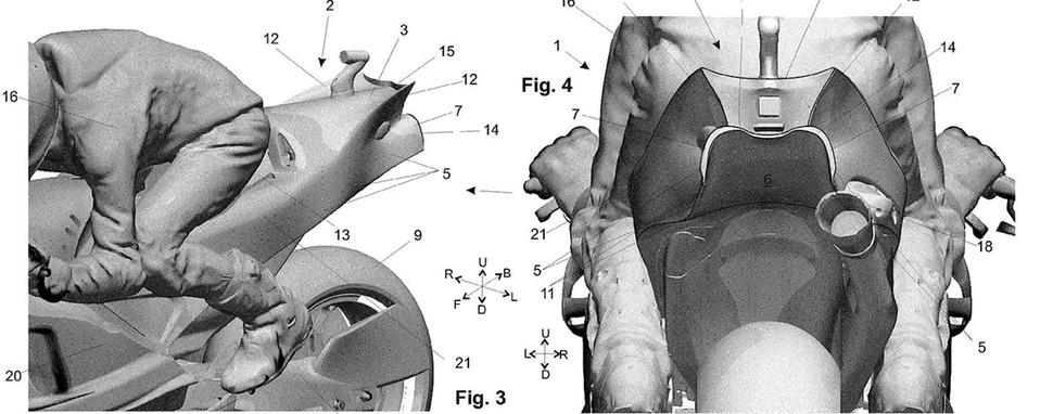 Второй патент относится не к вертикальным панелям на маятнике, а к выраженному тоннелю между верхней частью заднего колеса и нижней частью основы сиденья. Там же имеется отогнутый вверх спойлер. Этот тоннель, подобно диффузору гоночного автомобиля, предназначен для отвода воздуха из-под днища мотоцикла, чему способствуют два воздухозаборника снизу мотоцикла перед задним колесом. Этот приём Aprilia уже несколько лет использует на своих GP-шных мотоциклах, и конкуренты уже переняли его, но туннель над задним колесом имеет конструкцию, усиливающую этот эффект за счёт ускорения воздушного потока и увеличения прижимной силы и устойчивости. На верхней поверхности крылья, простирающиеся вверх, соединяются сзади перевёрнутым спойлером, который должен способствовать отводу воздуха из области под хвостом, создавая пространство внутри хвостовой части, о котором в патенте просто сказано, что там "могут располагаться некоторые узлы мотоцикла". Вероятно, это нечто наподобие "салатной коробки" на GP-шных Ducati, которая появилась в 2017 году. Считается, что в ней находится инерционный демпфер, помогающий предотвратить нежелательные вибрации и вобблинг, а кроме него - часть электроники мотоцикла.