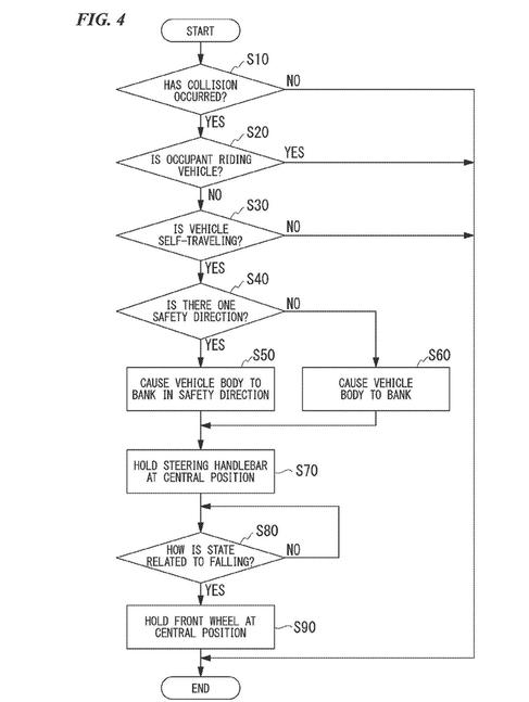 Согласно патенту, мотоцикл оснащается актюатором рулевого управления, модулем управления актюатором, модулем определения препятствий и модулем определения статуса водителя. Актюатор рулевого управления способен подруливать передним колесом по команде модуля управления, а тот в свою очередь управляется модулем определения препятствий.