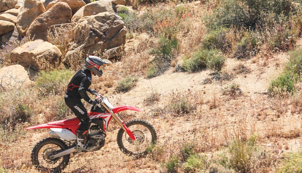 Через несколько минут тестовых заездов мотоциклов на нашем испытательном треке стало ясно, что у Honda и Yamaha были две разные идеи о том, каким должен быть идеальный кантри кроссовый мотоцикл. Yamaha имеет тонны крутящего момента на низких и средних оборотах, что позволяет без труда брать подъемы и быстро набирать обороты при смене направления на узких тропинках. Honda не так хорошо едет на низах и большую часть своей мощности отдает с ростом оборотов, имеет хороший средний диапазон, просит открутить ручку и дать еще газу.