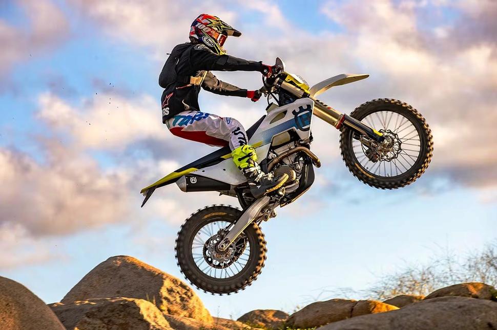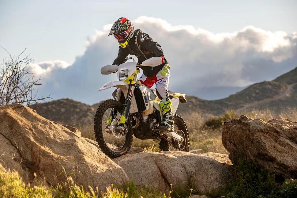 Husqvarna FE 350w 2024 - один из лучших универсальных внедорожных мотоциклов. Двигатель управляемый и покладистый, его 33,1лс достаточно для любой местности, а крутильный характер делает его великолепным на быстрых участках и кроссовой трассе. Ну и для покорения крупных камней и крутых уступов тоже.