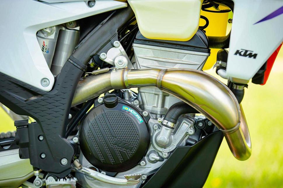 KTM каким-то образом сумели улучшить и без того идеальный мотор - даже на фоне KTM 350 XC-F 2022 года двигатель версии 2023 года стал ещё интереснее. Степень сжатия подросла с 14,2:1 до 14,6:1, и владельцы прошлой версии моментально ощущают подросшую мощность и тягу. Впрочем, эти ощущения ещё предстоит подтвердить или опровергнуть на диностенде.