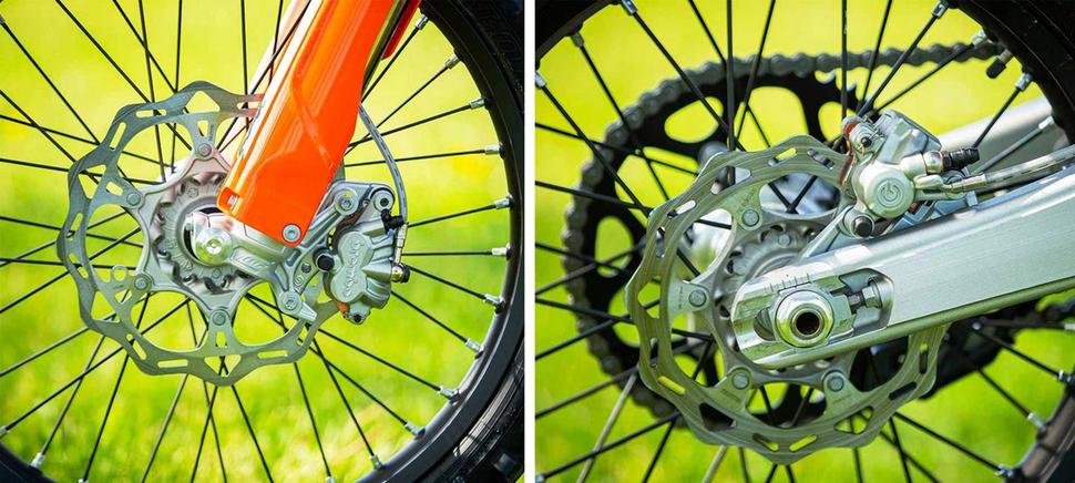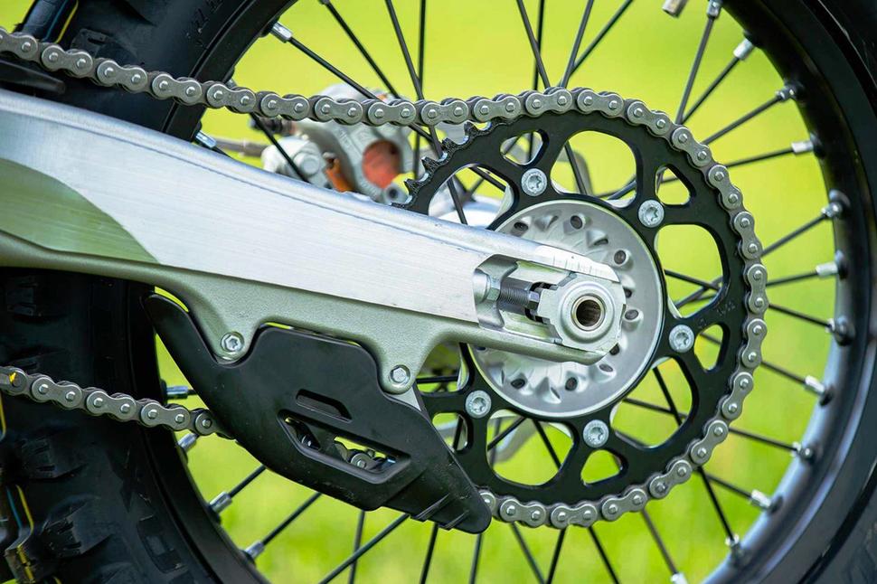KTM 350 XC-F с завода комплектуется защитой картера, так что из желательных дополнений остаются только кожухи тормозных дисков. Интересно, что штатные звёзды (14/47) позволяют установить заднюю ось в максимально заднее положение относительно шарнира маятника. Было бы любопытно проверить, как такое положение оси повлияет на другие модели на той же платформе, потому что для 350 XC-F оно очень подходит. Незначительные изменения такого плана сделали его управляемость ещё лучше, чем у 250 XC-F - вероятно, из-за более жёстких в стоке настроек подвесок и положения оси, а также более бодрого за счёт кубатуры двигателя.