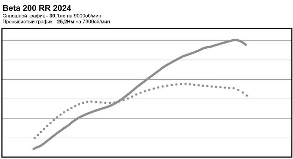 На диностенде стандартная версия Beta 200 RR 2024 года показала пиковые 30,1лс на 9000об/мин и 25,2Нм на 7300об/мин. Ещё в 2022 году на том же диностенде побывала 200 RR Race Edition, и её показатели тогда составили 31,0лс на 8900об/мин и 25,6Нм на 7700об/мин.
