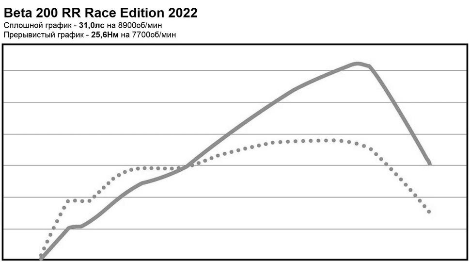 Beta 200 RR Race Edition 2022 года, заднее колесо которой обуто в асфальтовую шину, на диностенде выдала максимальные 31,0лс на 8900об/мин и 25,6Нм на 7700об/мин. Любопытно, что эти цифры весьма сравнимы с ещё одним европейским двухтактником - Husqvarna TE 150i 2022 года. Вероятно, напрашивается сравнение этих двух моделей!
