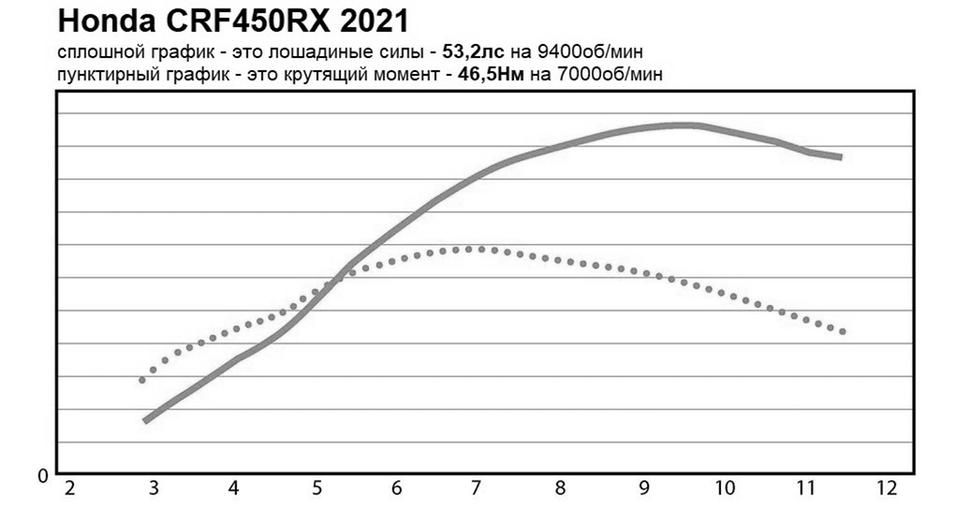 На диностенде новая Honda CRF450RX 2021 показала пиковую мощность в 53,2лс на 9400об/мин и 46,5Нм на 7000об/мин, что на 0,5лс и на 1,5Нм ниже прошлогодней версии. Однако, стоит выяснить на практике, так ли уж ей недостаёт мощности!