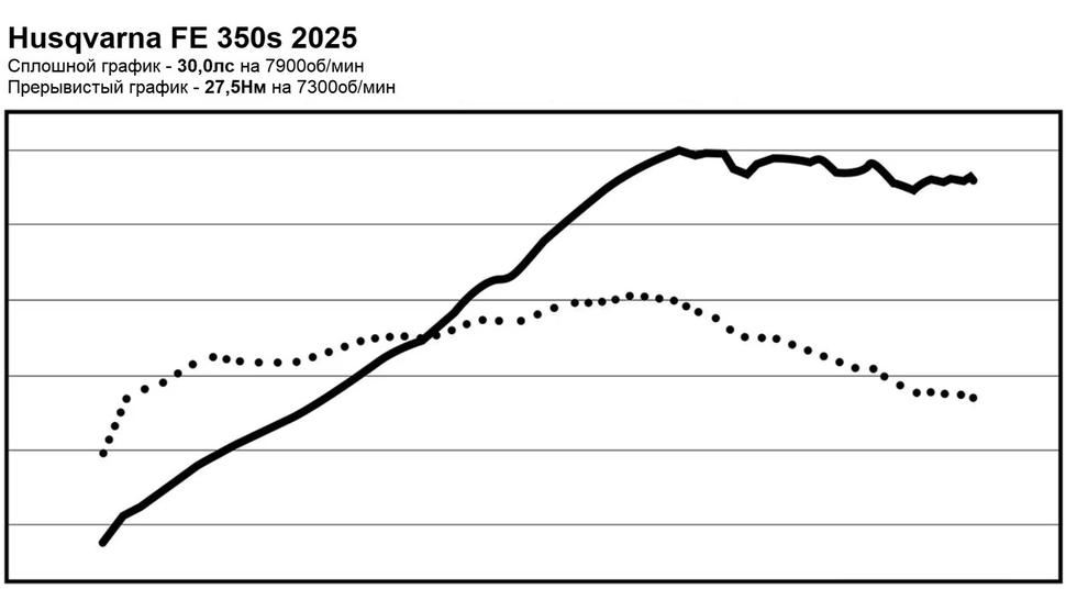 На диностенде Husqvarna FE 350s показала пиковые 30,0лс на 7900об/мин и 27,5Нм на 7300об/мин. Причём верхняя треть диапазона оборотов не может похвастаться особой тягой, поскольку двигатель Хаски настроен на максимальную отдачу на средних оборотах и имеет неплохие низы.