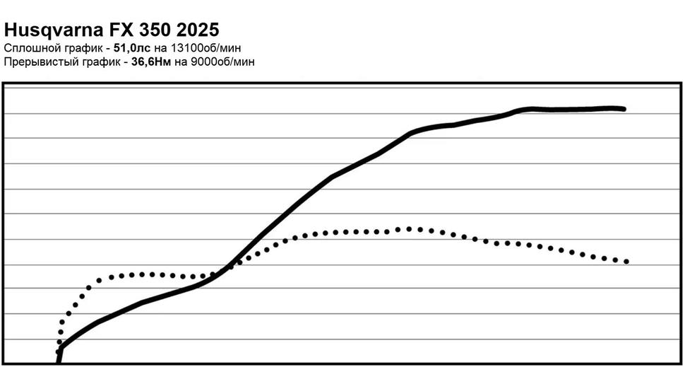 Четырёхтактный инжекторный 350-кубовый одноцилиндровый двигатель Husqvarna FX 350 с двумя верхними распредвалами и жидкостной системой охлаждения на диностенде показал впечатляющие 51,0лс на 13100об/мин и 36,6Нм тяги на 9000об/мин с 18-дюймового заднего колеса. Это всего лишь на 2лс меньше, чем выдала в пике Husqvarna FC 450 2025 года. Пиковое значение крутящего момента отличается сильнее - на 7,7Нм, но это всё равно весьма неплохая цифра, учитывая отличие в 100куб.см рабочего объёма.
