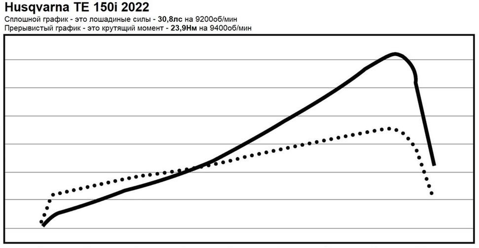 Снаряжённая масса Husqvarna TE 150i 2022 составляет 105кг, высота по седлу - 94,8см, а на диностенде TE 150i, обутая в дорожную шину для максимального зацепа с барабаном, выдала в пике 30,8лс на 9200об/мин и 23,9Нм на 9400об/мин. Оба графика, мощности и крутящего момента, чрезвычайно линейны с 2200 вплоть до 9400об/мин, после которых оба графика довольно резко падают. Вполне типичный характер для двигателя с инжекторной системой питания и хорошо оптимизированной топливной картой - без промежуточных пиков и провалов, с мощными верхами и чётко обозначенным пиком мощности.