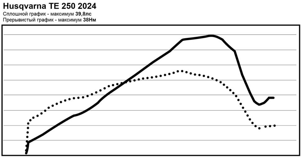 В модельном ряду Husqvarna имеется три стандартные двухтактные эндуро-модели: TE 150, TE 250 и TE 300. В этом году Husqvarna TE 250 попала на тест, а перед этим - на диностенд, где его двухтактный одноцилиндровый инжекторный двигатель рабочим объёмом 249куб.см выдал пиковые 39,8лс и 38Нм тяги с заднего колеса.