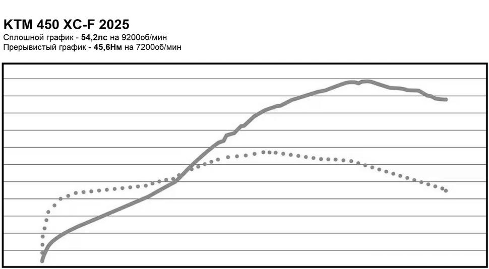 На диностенде KTM 450 XC-F 2025 года выдал пиковые 54,2лс на 9200об/мин и 45,6Нм на 7200об/мин. По сравнению с моделью 2023 года это на 0,4лс меньше, но на 0,8Нм больше.