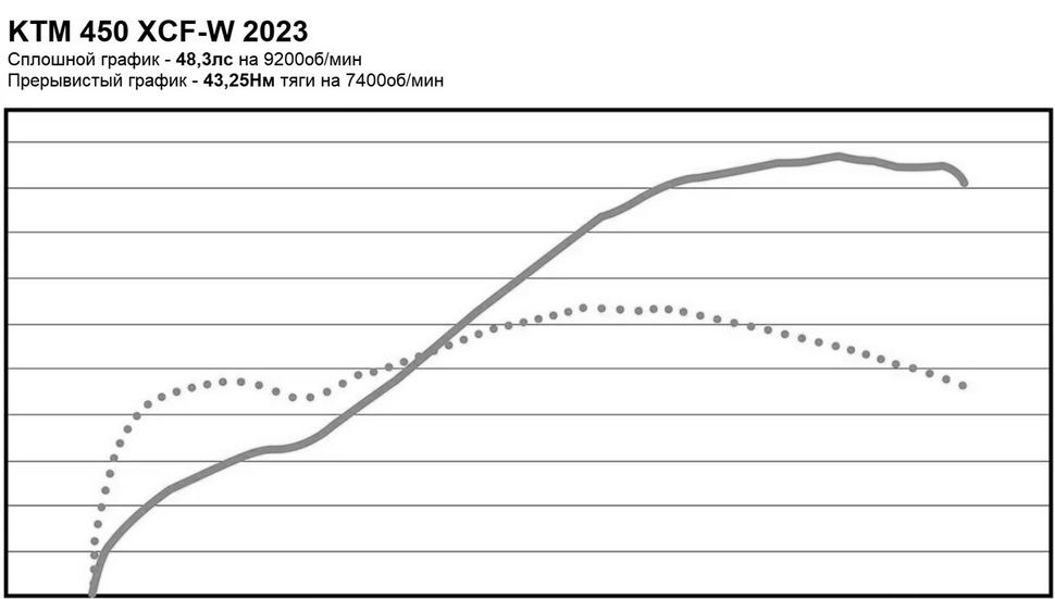 Будучи новинкой 2023 года, 450 XCF-W впервые попал на диностенд. С колеса, обутого в дорожную шину, KTM 450 XCF-W 2023 года показал пиковые 48,3лс на 9200об/мин и 43,25Нм тяги на 7400об/мин. Это не самые высокие значения для 450-кубового четырёхтактного внедорожника, но характеристика его мотора впечатляет: он тянет с самых низких оборотов, не выдыхаясь до самой отсечки, и при этом всегда остаётся управляемым и послушным.