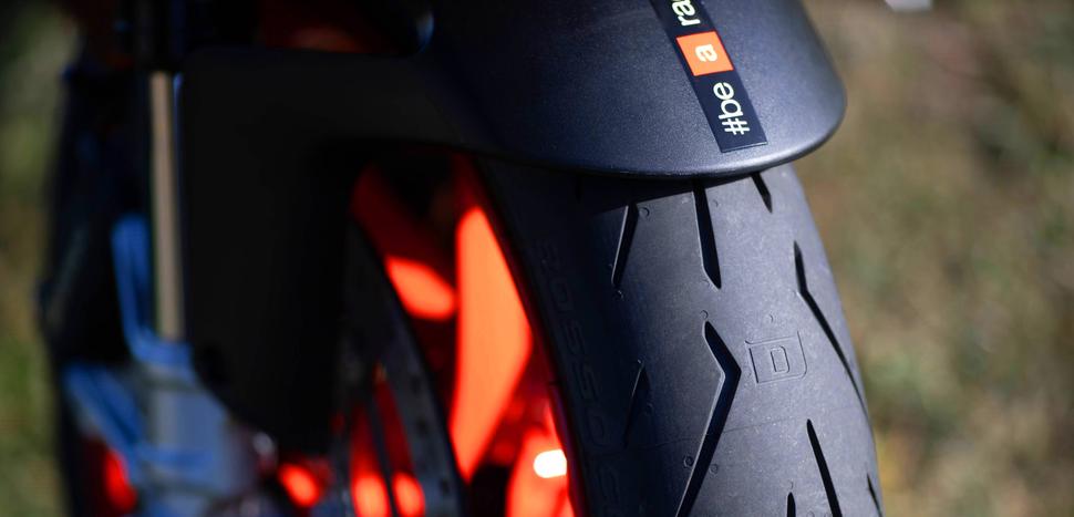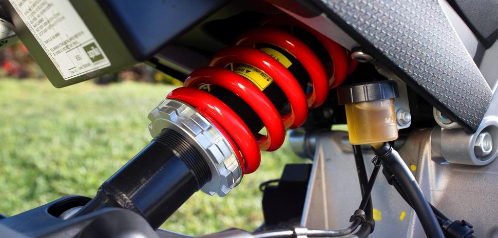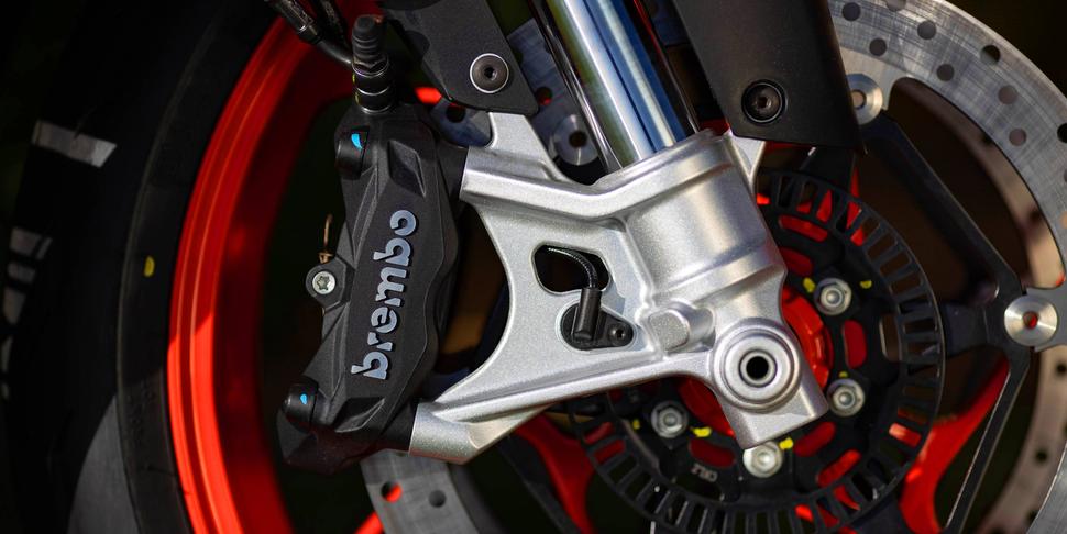 Как и на RS, маятник Aprilia Tuono 660 прикручен прямо к двигателю и подвешен на амортизаторе с регулировкой преднатяга и отбоя (без настройки сжатия). Спереди - перевёрнутая 41-я вилка Kayaba, тоже с настройками преднатяга и сжатия в одном из перьев. Тормоза у RS и Tuono тоже идентичные, а именно - 320-е диски с радиальными суппортами и машинкой Brembo в переднем контуре. Как можно догадаться, их более чем хватает для мощного и точного торможения.