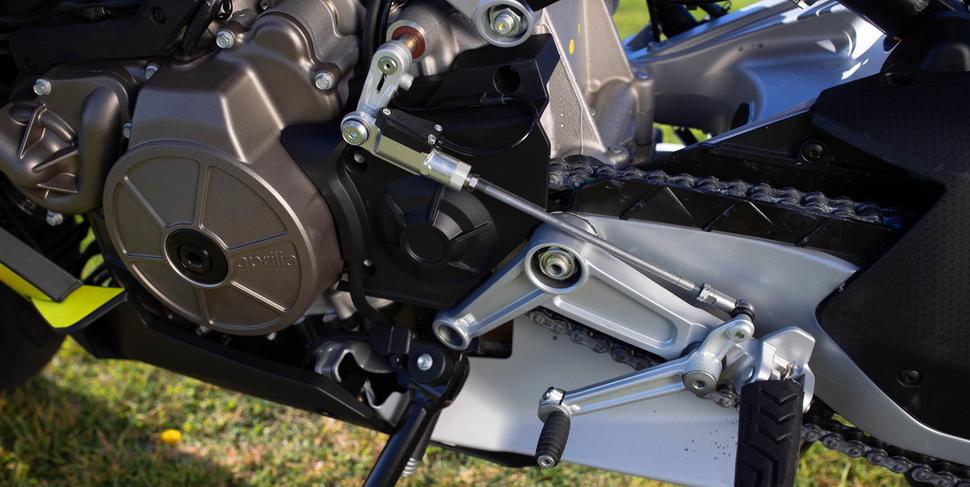 Но есть и небольшие отличия Aprilia Tuono 660 от спорт версии Aprilia RS 660, которые касаются дорожного предназначения нейкед-версии. Первое и главное — это руль вместо клипонов, руки на котором располагаются выше и ближе к телу. Подножки вынесены вперёд и ниже и оснащены резиновыми вставками, гасящими вибрацию. Отбойники руля расположены несколько шире, что облегчает маневрирование на низких скоростях. Любопытная деталь: двигатель, корпус которого является элементом силовой конструкции, имеет на одно крепление меньше, чем у RS, что делает шасси в целом менее жёстким и более комфортным.