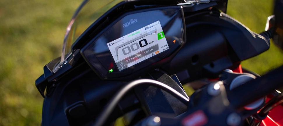 Два "дорожных" режима называются Commute и Dynamic (т.е. Городской и Динамичный), а третий - соответственно Пользовательский. Возможность регулировки отклика на газ, трекшн-контроля, вилли-контроля и ABS в этом сегменте не нова, но обычно встречается на более дорогих моделях. А вот регулируемое торможение двигателем позволяет настроить характер мотоцикла по своему вкусу - помните, я говорил о том, что Tuono может быть и скромником, и спортбайком? Вот это ещё один аспект такого раздвоения личности. Здорово то, что все настройки в меню действительно меняют характер работы мотоцикла - он от этого ощущается более живым и послушным, продуманным и полезным, если угодно.