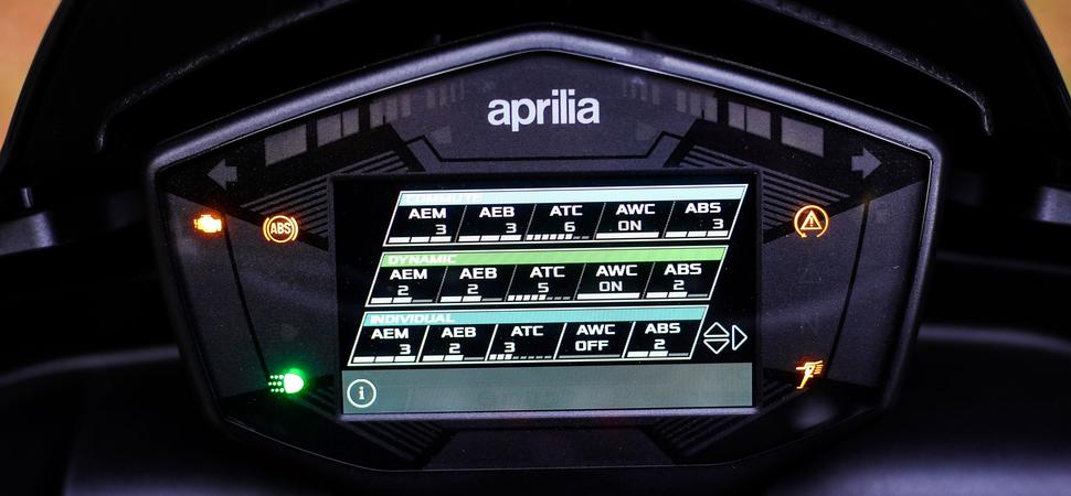 Самой интересной особенностью новой Aprilia Tuono является комплект электронных ассистентов APRC (расшифровывается как Aprilia Performance Ride Control). Причём это не кастрированная версия флагманского комплекта, а специально разработанный под эту модель набор. В версии 2021 года APRC включает три режима езды для дорог и ещё два - для трека. Приборная панель имеет разные раскладки для трека и дороги, и в зависимости от выбранного режима приборки будут доступны режимы езды. В каждом варианте доступен полностью настраиваемый режим езды, в котором можно отрегулировать отклик на газ, торможение двигателем, вилли-контроль и ABS. При установки опционального устройства измерения инерции, трекшн-контроль и вилли-контроль можно отрегулировать по отдельности, но в базе они настраиваются вместе.