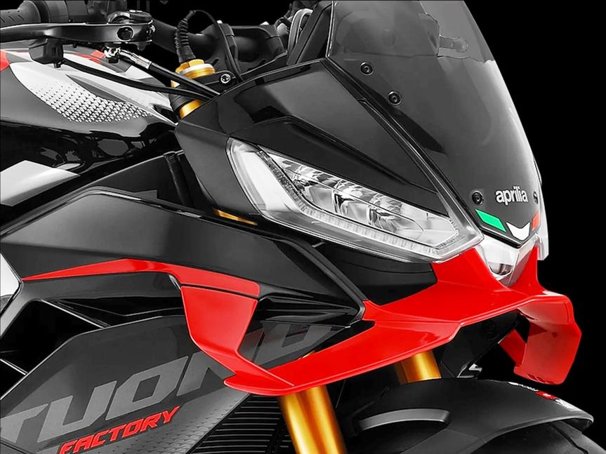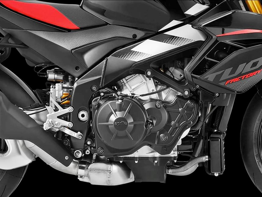 В результате заявленная мощность составляет 180лс при 11800об/мин, а крутящий момент - 121Нм при 9650об/мин. Это самая мощная Tuono в истории, хотя её показатели всё ещё ниже, чем у RSV4. Для сравнения: RSV4 развивает 220лс и 127Нм крутящего момента, что делает её самым мощным дорожным мотоциклом Aprilia. Оба двигателя соответствуют экологическому стандарту Евро-5+. Новые вентиляторы охлаждения и изменённая форма облицовки направляют больше холодного воздуха к двигателю, отводя тепло от райдера.