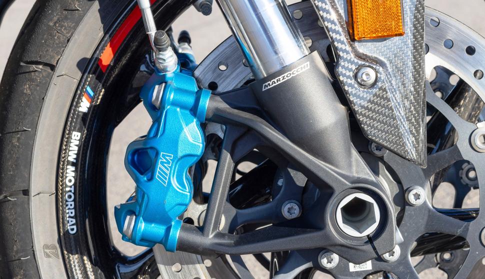Тормоза BMW M 1000 R Competition - тоже изумительны. Суппорта Nissin специальной серии M дают мощнейшее тормозное усилие и превосходную информативность, а хитроумная наклонная ABS позволяет уверенно выжимать рычаг даже в мокрую и холодную погоду.