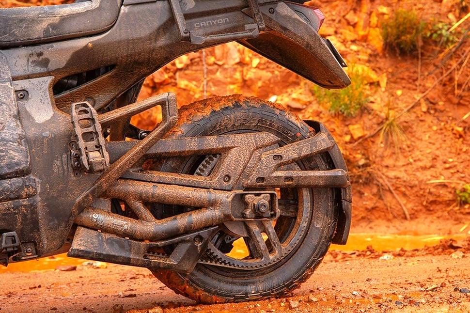 Вот в этом и преимущество Canyon: его можно пустить в занос, позволить ему скользить и петлять по грязи, колеям, лужам, да даже по снегу или переправе через ручей, и он не упадёт, не опрокинется через руль, не сойдёт с пути и не выскользнет из-под вас. Можно, конечно, застрять, если заехать куда-нибудь в слишком смелое место, но потерять управление этой сверхустойчивой платформой почти невозможно. Можно в заносе развернуться на 180 градусов и абсолютно не потерять управления.