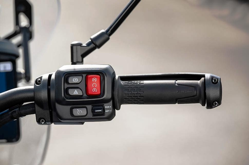 Тормоза комбинированные, управляются педалью под правой ногой. Отдельного переднего тормоза нет, а поскольку нет и сцепления, то руль лишён рычагов вообще. Это поначалу даже сбивает с толку. Может, Can-Am стоит поставить дублирующие рычаги тормозов как на скутере, чтобы занять мышечную память. Да и рычаг передач у левой ноги тоже пригодился бы: курками коробка переключается довольно неплохо, но на левом пульте слишком уж много всего: поворотники, гудок, курки эти… особенно когда едешь в стойке на неровной грунтовке, вместо переключения вверх запросто можешь весело побибикать.