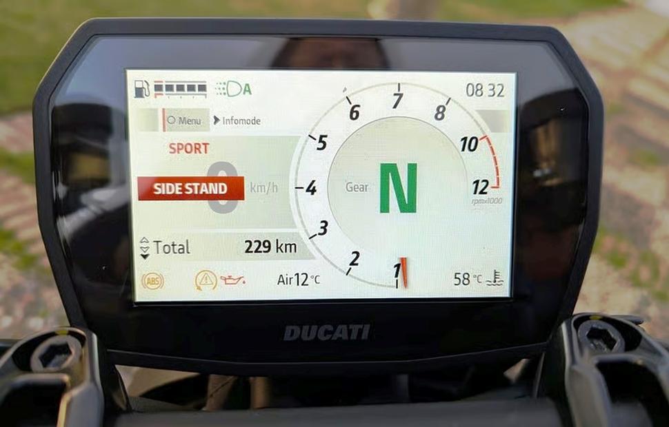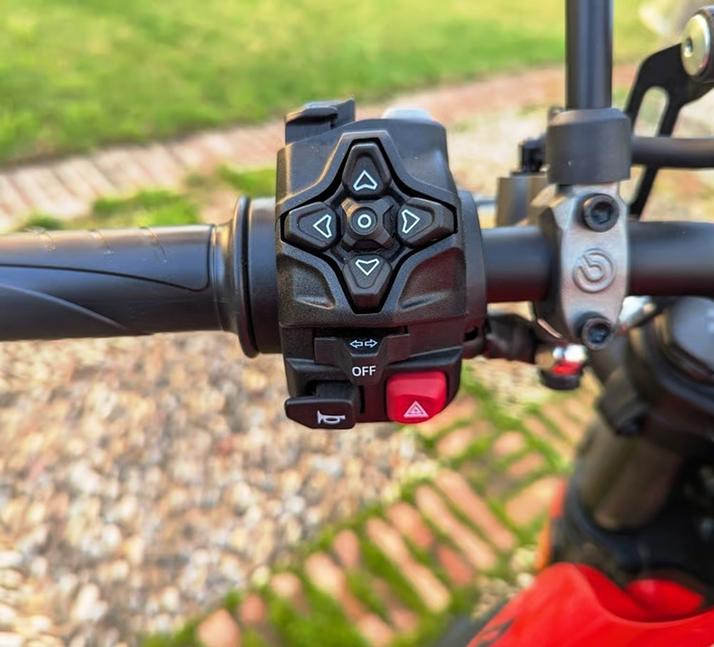Электронные ассистенты выбираются и настраиваются через удобный интерфейс TFT-дисплея, который тоже настраивается. На левом пульте есть кнопка Mode для переключения режимов езды и четырёхпозиционный джойстик с кнопкой Select в центре для навигации по меню. Вот этот пульт оставляет желать лучшего. Выглядит и ощущается он как-то простовато, а центральная кнопка Select имеет привычку залипать в нажатом положении. Стефано заметил, что это была горячая тема для конструкторов, и они перебрали кучу версий, прежде чем остановиться на этой. Но тут, похоже, прогадали.