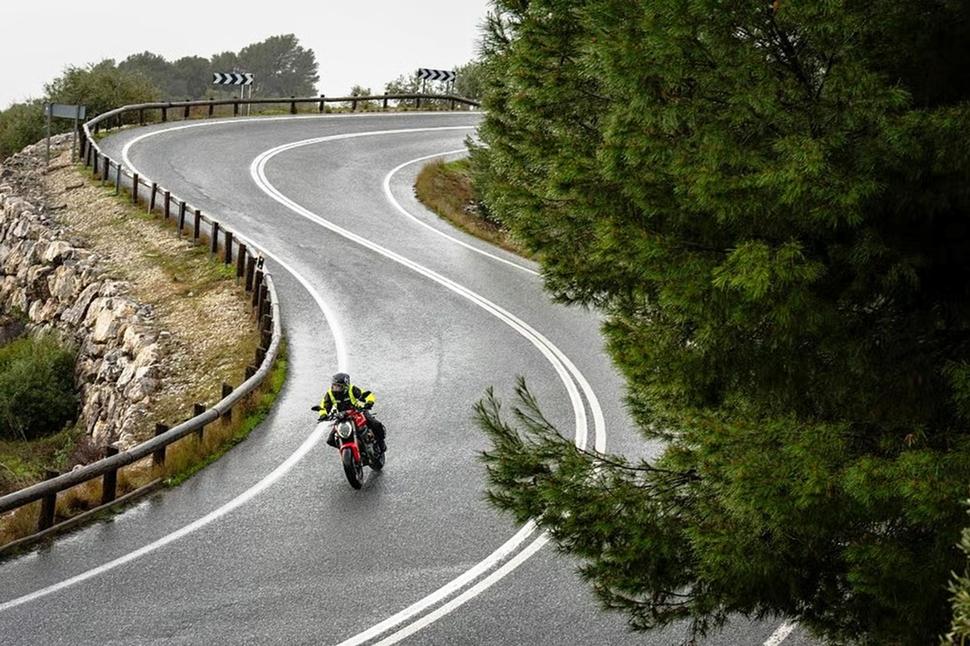 Организаторы теста были полны надежды, когда прокладывали для журналистов живописный маршрут в горах за пределами Малаги. Надежда была и у участников, когда колонна стартовала. Но по мере того как поднимались над городом, а темп и интенсивность дождя нарастали, надежду пришлось отставить в сторону и сосредоточиться на насущном. И тут выяснилось: даже несмотря на щемящую тоску в душе при виде идеального, гладкого, наклонного поворота, который был абсолютно мокрым и вдобавок перечёркнут речкой, бегущей прямо поперёк асфальта, - даже осознавая, что нельзя просто влететь туда на полном газу (уиии!!), - всё равно получаешь ни с чем не сравнимое удовольствие от дня, проведённого на двух колёсах на этом совершенно новом Ducati Monster 2026.
