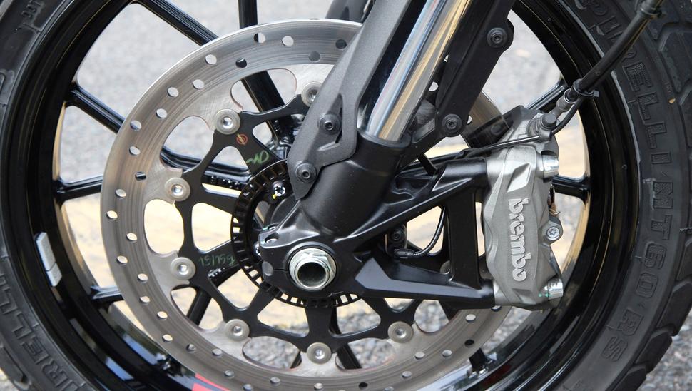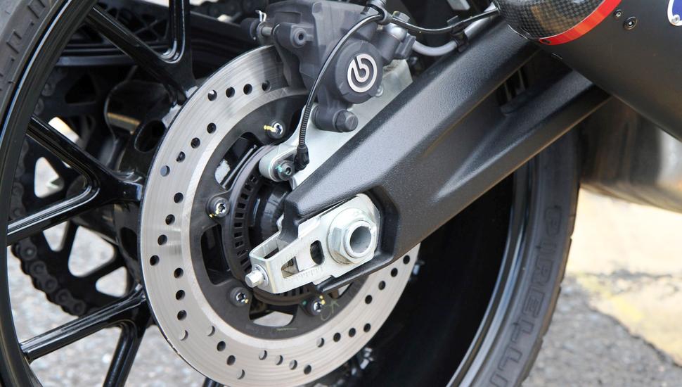 Тормоза, как обычно, Brembo: спереди один 330-й диск с радиальным четырёхпоршневым суппортом и обычным (не радиальным) главным цилиндром, который вполне адекватен на дороге. Тормоз не перегревается и остаётся чётким и информативным, так что тут особо не на что жаловаться. Что касается подвесок, то компоненты от Kayaba имеют только одну регулировку - преднатяга задней пружины.