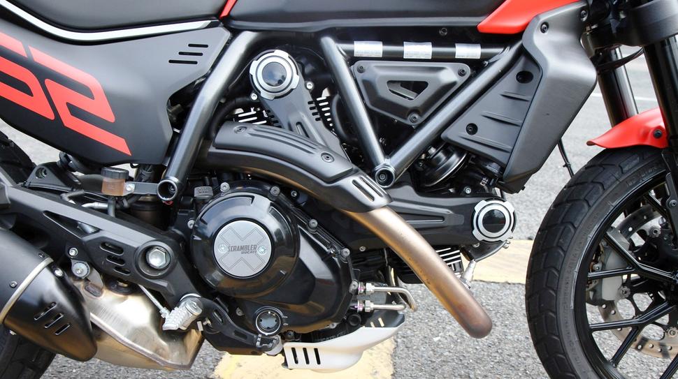 Ключевой элемент индивидуальности Ducati Scrambler - это, конечно, двухцилиндровый двигатель Desmodue. Он оснащён новыми крышками сцепления и генератора с логотипом "X", а крышки ремня теперь имеют более изысканную форму. Форма выхлопа тоже претерпела изменения.