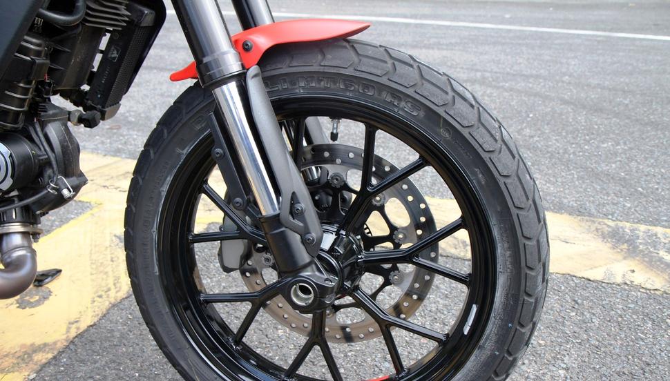 Но если вы ездите в основном по асфальту, то Ducati Scrambler Full Throttle порадует вас как мало какой другой мотоцикл. Он лёгкий во всех отношениях: в плане веса, в плане рулёжки и в плане управляемости в целом. Руль, возможно, высоковат, но чувствительный и информативный. Рулится мотоцикл остро, даже и не подумаешь, что спереди стоит 18-е колесо. Увы, но размер резины не самый ходовой, так что вариантов на рынке немного.