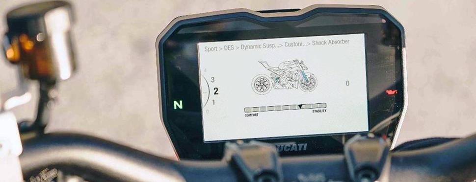 Чтобы донести идею электронной регулировки подвесок, Ducati решили привязать настройки к параметрам езды. Так что дополнительно к возможности установить фиксированные настройки, райдер может отрегулировать степень увеличения жёсткости на торможениях, выбрав между "эффективностью" и "комфортом". То же самое касается ABS, у которой есть несколько уровней вмешательства - "эффективность" обеспечивает минимальное вмешательство, а "безопасность" - максимальное. Суровые гонщики-олдфаги наверняка сморщатся от мысли, что мотоцикл будет на ходу вмешиваться в жёсткость подвесок, и я тоже отчасти морщусь - но не могу отрицать, что сама идея вполне осмысленна.