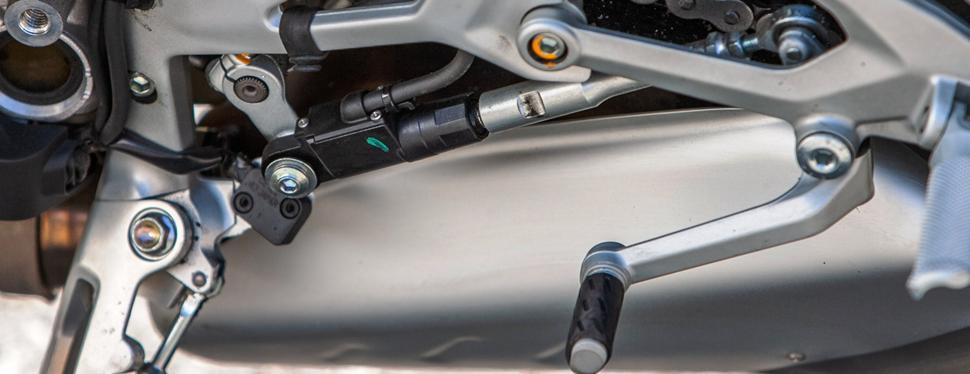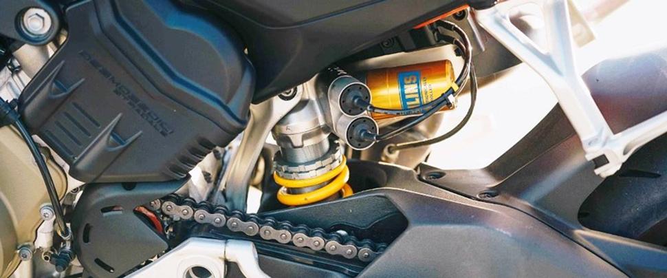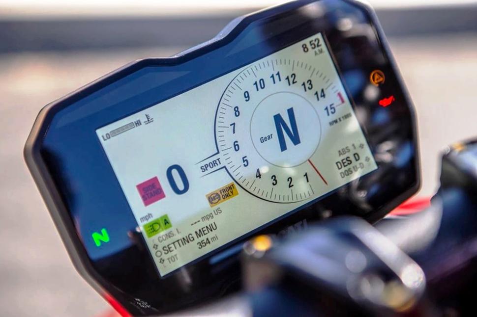Ducati Streetfighter V4 S имеет богатый выбор настроек. Система меню, управляемая двумя качельками на левом пульте, позволяет райдеру переключаться между тремя режимами езды (Дорожный, Спортивный и Гоночный) и обеспечивает возможность настроить и отрегулировать буквально всё - от калибровки ABS после замены резины и до цвета подсветки экрана. S-ка оснащается полуактивной подвеской Ohlins, что означает, что настройки сглаживания регулируются электроникой на ходу - автоматически и вручную. Ручная регулировка находится глубоко в меню - несколько замудрённо.
