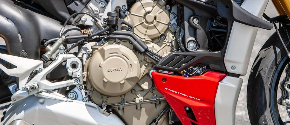 Но главный продающий фактор этого мотоцикла - это, без сомнения, двигатель. Panigale-вский 1103-кубовый четырёхцилиндровый V образный двигатель со своеобразным порядком вспышек и обратным направлением вращения коленвала а-ля MotoGP. Заявленная выходная мощность с коленвала составляет 208 лошадей на 12750 оборотов в минуту и 122,5 Нм на 11500 делает Ducati Streetfighter V4 S новым королём журнальных сравнений. А для тех, кто предпочитает жизнь, а не бумагу, главным фактором станет звук: необычный порядок вспышек был применён для того, чтобы приблизить характер V4 к V-твину, и звук получился соответственный. На холостых он как и положено звучит как увалень, по-другому и не скажешь, и по этому звуку совершенно не скажешь, что он крутится до 14500 оборотов в минуту.