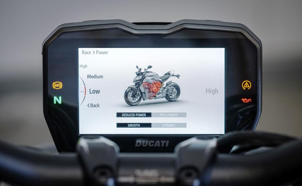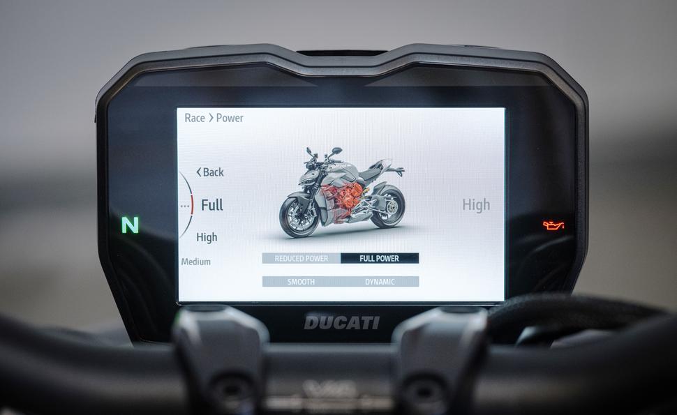 Новые прорывы в настройке программного обеспечения Ducati позволили регулировать крутящий момент для каждой передачи индивидуально, ещё больше улучшая характер мотора. Но для тех, кому всё время мало, Ducati снабдили Streetfighter V4 режим Полной мощности (Full Power). Нетрудно догадаться, что он позволяет взять всё, на что способен Desmosedici Stradale V4, лишь слегка ограничивая тягу и мощность на первой передаче, чтобы мотоцикл не вставал на дыбы и не срывал колесо при неосторожном открытии газа. Поскольку режим Полной мощности - дело серьёзное, он не прикреплён ни к одному из штатных режимов езды. Его нужно вручную выбирать в меню. Ещё есть режим Пониженной мощности, ограничивающий её до "всего лишь" 165лс и предназначенный для езды в ситуациях с плохим зацепом.