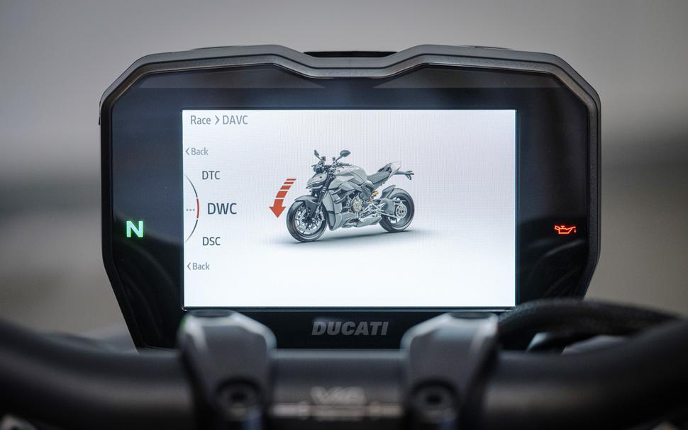 Ещё одна электронная особенность Ducati Streetfighter V4 S - это новый вариант раскладки TFT-дисплея приборной панели Track EVO. Позаимствованный напрямую у Panigale, новый режим отличается несколькими ключевыми компонентами: большим индикатором передачи спереди по центру экрана, отдельные поля в правой части экрана для каждого из электронных ассистентов (трекшн-контроля, вилли-контроля, слайд-контроля и торможения двигателем). Когда какой-то из ассистентов вмешивается, подсвечивается его поле на дисплее. Это должно помочь райдеру точно настроить уровень вмешательства, когда он чувствует, что один из ассистентов срабатывает слишком сильно или наоборот недостаточно. В-третьих, на верхней части приборной панели появился зелёно-красный огонёк, сигнализирующий о подходящем моменте для переключения передачи. И, наконец, большой таймер круга слева от индикатора передачи, работающий автоматически, без необходимости нажимать кнопку каждый раз, когда райдер пересекает стартовую/финишную линию.