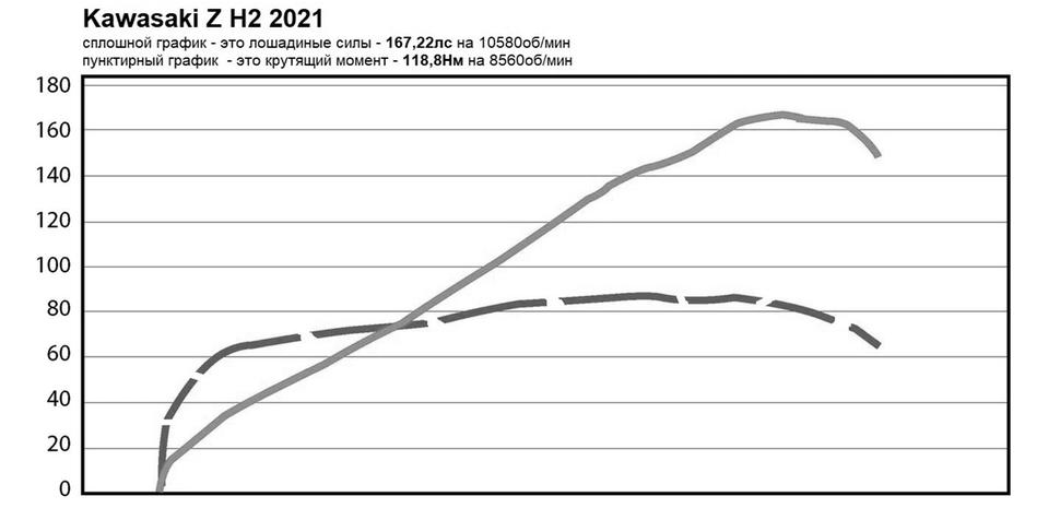 На диностенде Kawasaki Z H2 SE выдал впечатляющие 167,22лс на 10580об/мин и 118,8Нм на 8560об/мин. Его крутая, но равномерная кривая мощности обеспечивает ему при желании чертовски быстрое ускорение, но одновременно и позволяет ездить аккуратно и без рывков в повседневном городском темпе.