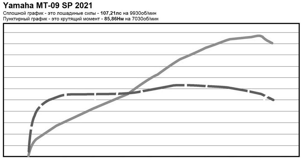 На диностенде MT-09 SP выдал пиковые 107,21лс на 9930об/мин и 85,86Нм тяги на 7030об/мин, что несколько больше, чем у других моделей на основе CP3.